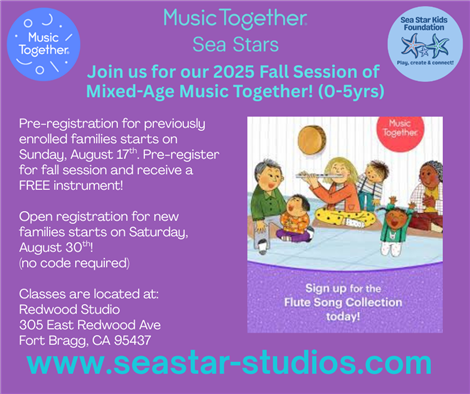 Music Together Sea Stars offers Music Together for Mixed Age classes (0-5 years) for families located on the Mendocino Coast.