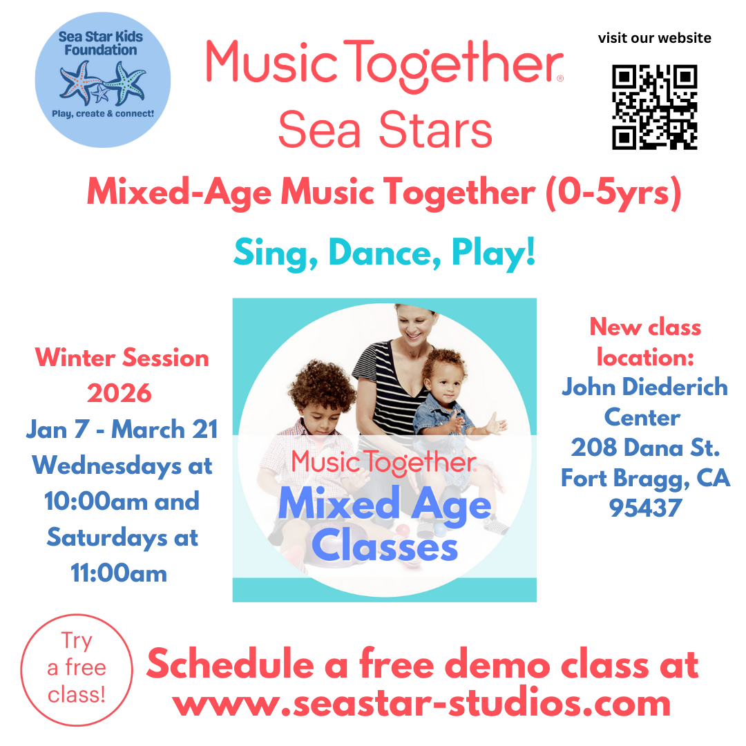 Music Together Sea Stars offers Music Together for Mixed Age classes (0-5 years) for families located on the Mendocino Coast.
